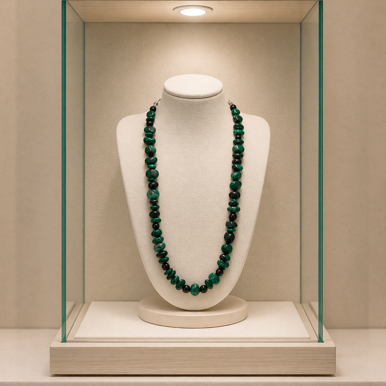 Each malachite piece is hand-tumbled to reveal its natural banding — no two stones identical, no two necklaces the same. The strand is finished with a silver-tone lobster clasp and sits beautifully at the collarbone. Wear it with a white linen shirt, a black evening dress, or draped over natural fibres — it belongs everywhere.